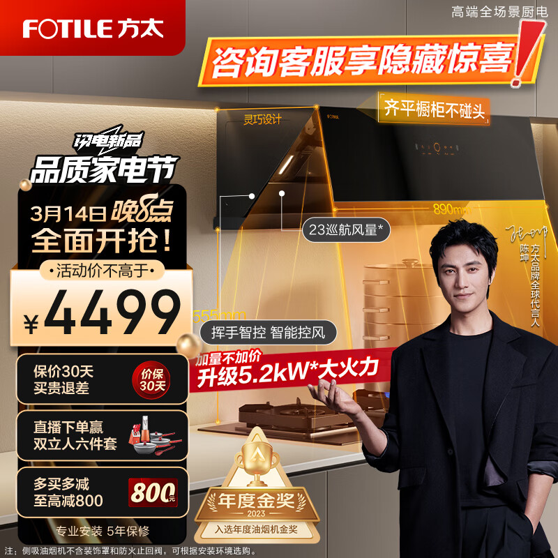 方太(FOTILE)抽吸油烟机灶具套装 侧吸式变频烟灶套装23大风量智能巡航挥手5kW燃气双灶 JCD10TA+TH27B天然气价格:4499.00元!