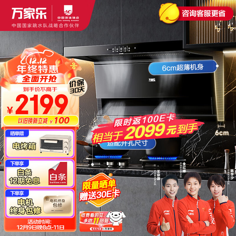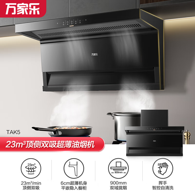 万家乐顶侧双吸油烟机 23立方抽油烟机灶具套装 68%高热效率灶具 家用挥手自清洗烟灶套装TAK5+AY6液化气价格:2299.00元!