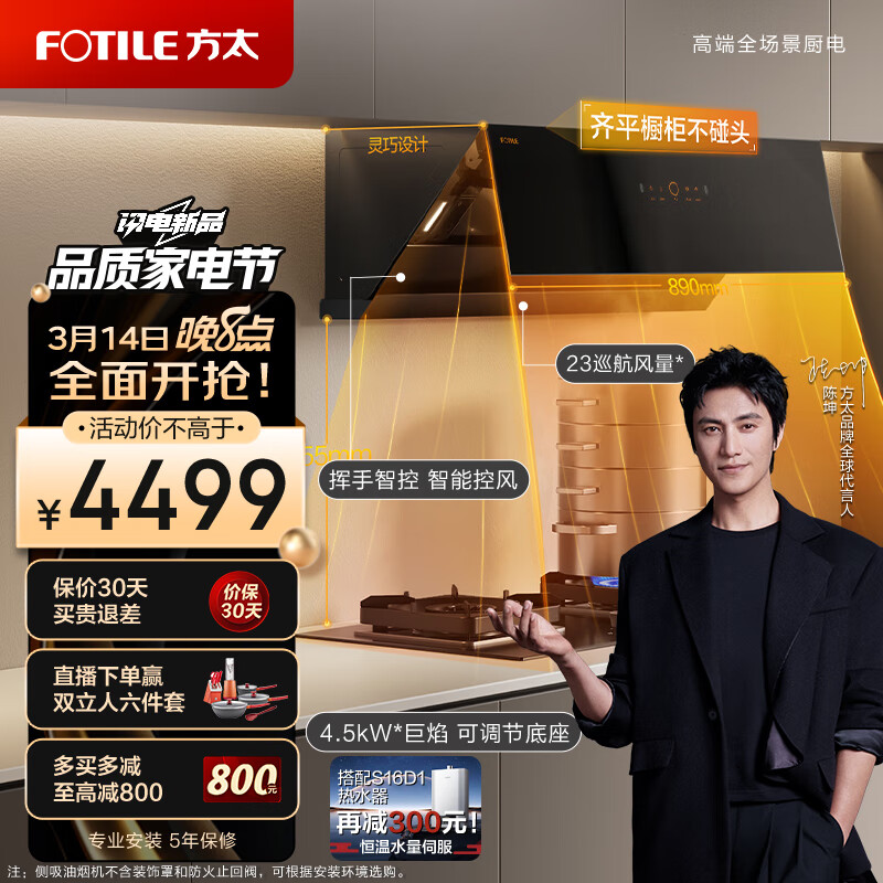 方太(FOTILE)抽吸油烟机灶具套装 侧吸式变频烟灶套装23大风量智能巡航挥手 煤气双灶JCD10TA+TH27B(液化气)价格:4499.00元!