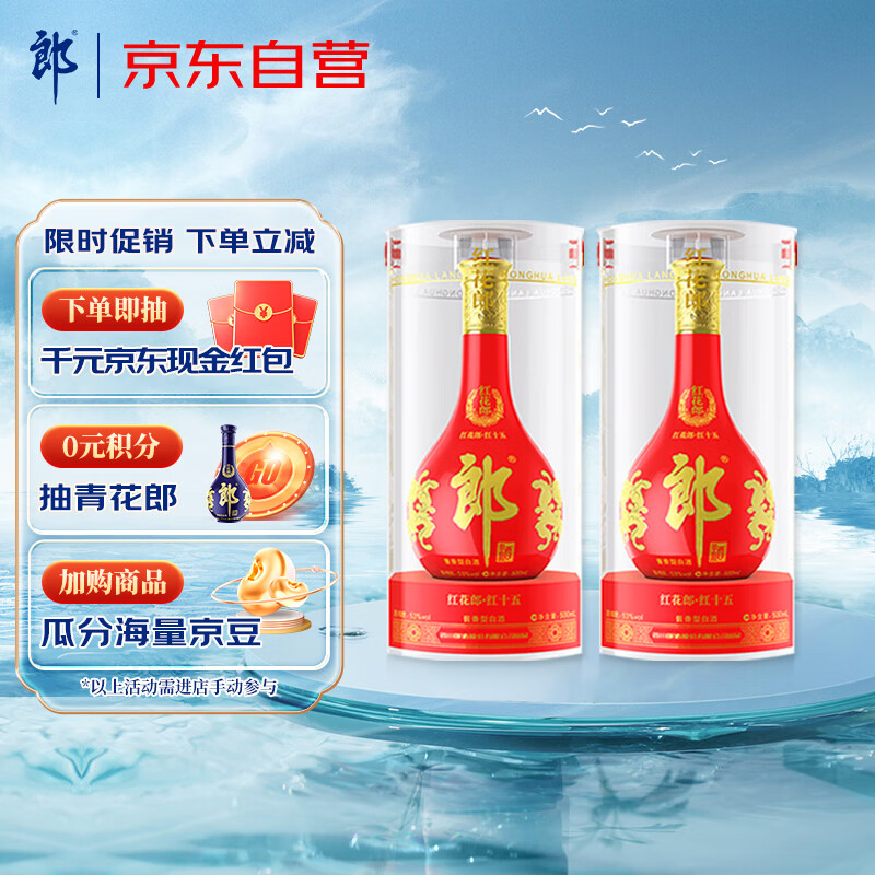 郎酒 红花郎15 酱香型白酒 53度 500ml*2瓶 双瓶装价格:1238.00元!