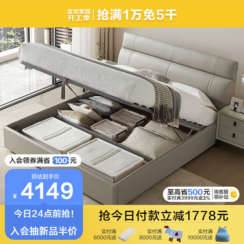全友家居 进口头层牛皮双人床意式极简1.5米储物高箱床105251A价格:5927.14元!