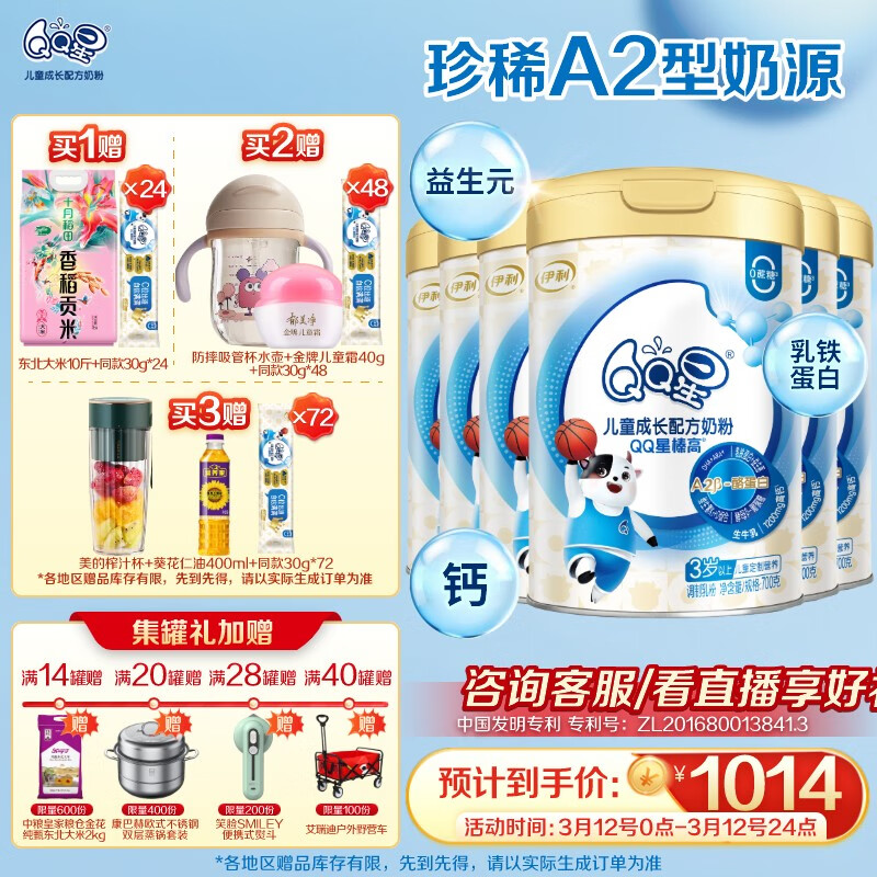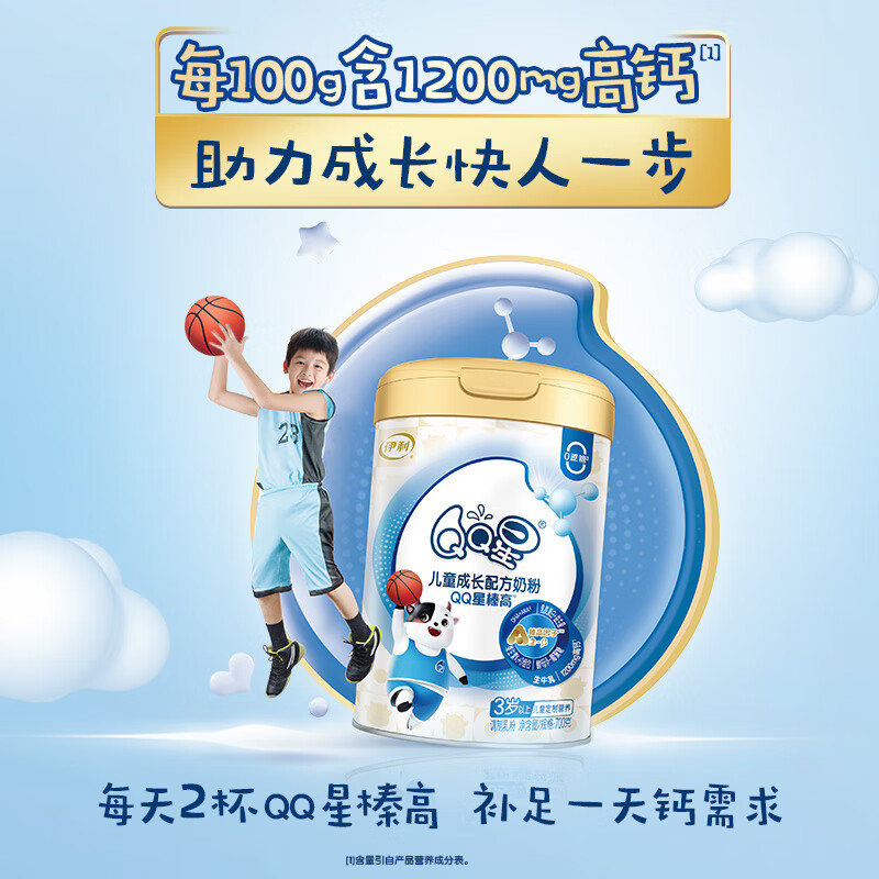 伊利QQ星榛高 A2奶源 儿童成长奶粉4段(3-12岁)700g*6 整箱装价格:1084.00元!