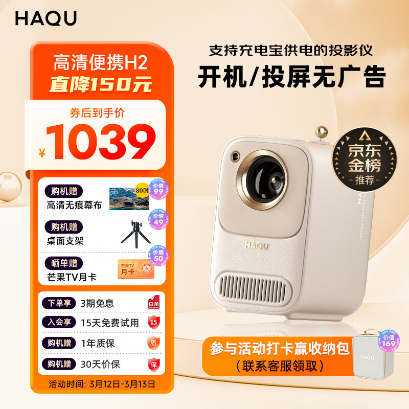 哈趣 H2 投影仪家用 投影机便携露营 智能家庭影院(400CVIA流明 TOF无感对焦 支持充电宝供电)价格:1049.00元!