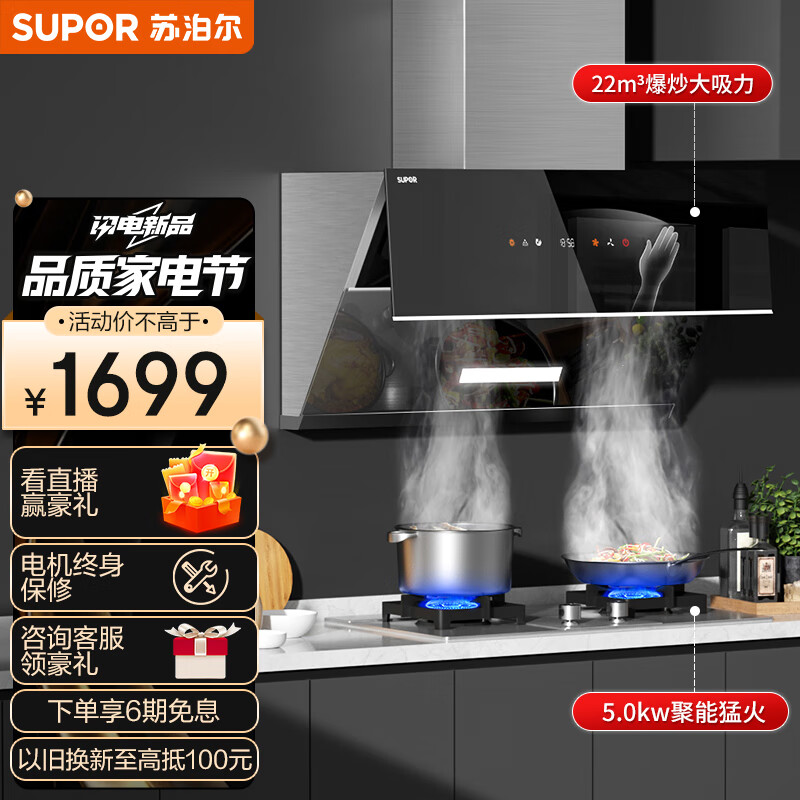 苏泊尔(SUPOR)抽油烟机 侧吸式烟机燃气灶具套装 22m3/min大吸力家用烟灶套装挥手智控智旋干洗 DJ50+S16液价格:1799.00元!