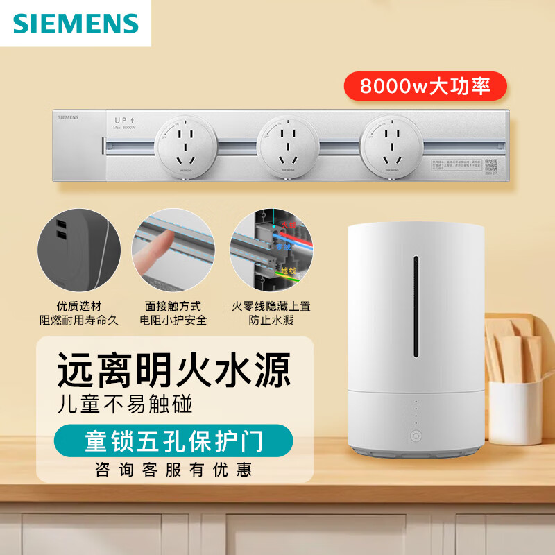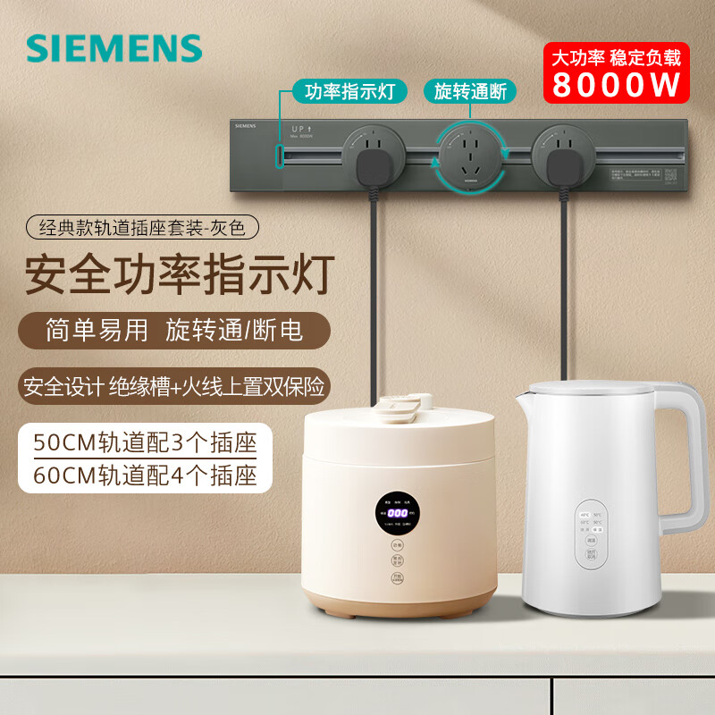 西门子(SIEMENS)8000W经典款轨道插座套装 可移动墙壁插座 明装大功率新国标 50cm轨道+3个五孔圆形插座 灰色价格:474.00元!