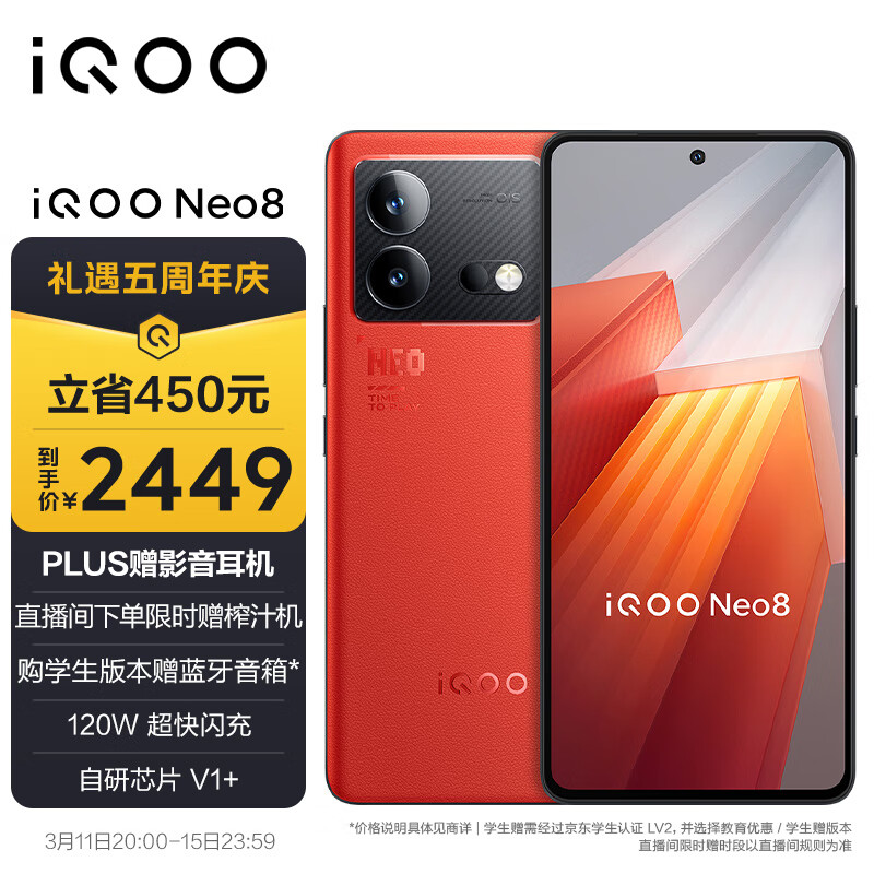 vivo iQOO Neo8 16+1TB 赛点 代骁龙8+ 自研芯片V1+ 120W超快闪充 5G游戏电竞性能手机价格:2899.00元!