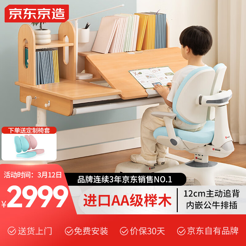 京东京造儿童书桌学习桌椅套装写字桌【进口AA级山毛榉 主动追背】1.2m蓝价格:3499.00元!
