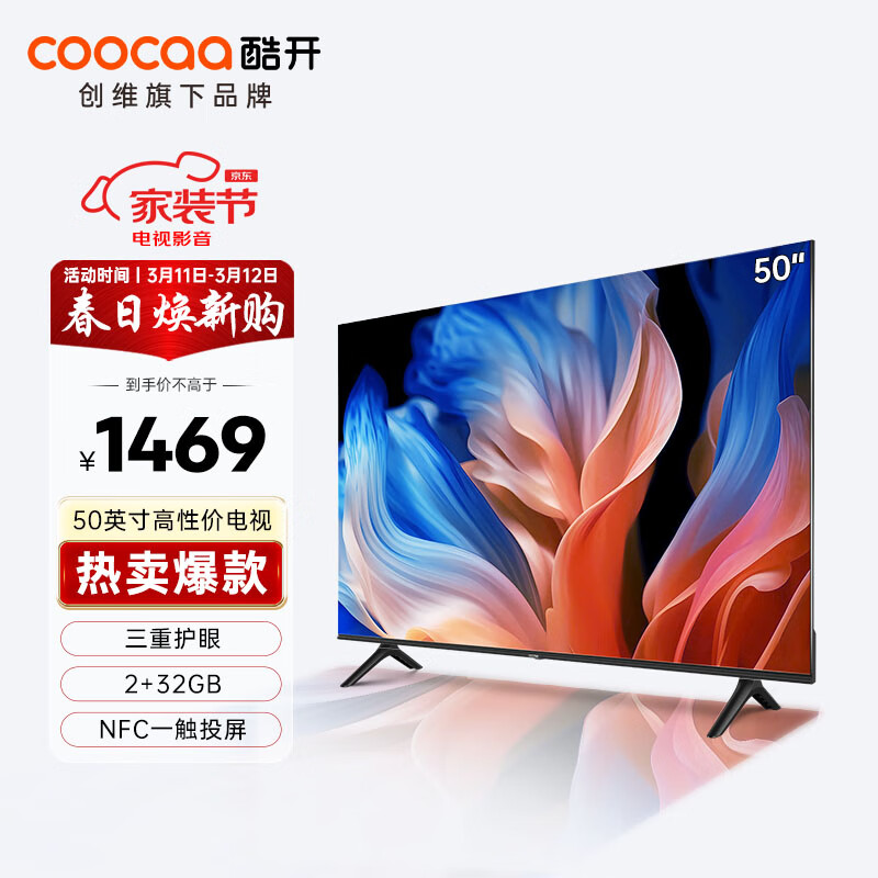酷开创维K3 50英寸电视 2+32G内存 无边屏 智能语音 多功能投屏平板游戏液晶电视机以旧换新50P3D价格:1599.00元!