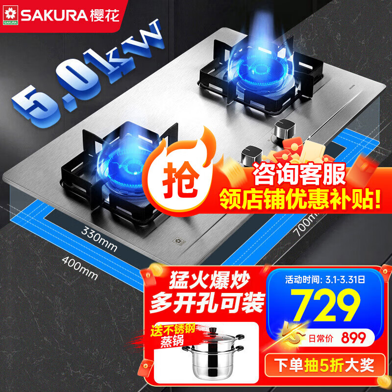 樱花(SAKURA)燃气灶天然气煤气灶双灶液化气家用台嵌两用家用不锈钢灶台一级能效大尺寸多开孔猛火灶 ADG05A 天然气5KW大火力可调节底盘价格:723.00元!