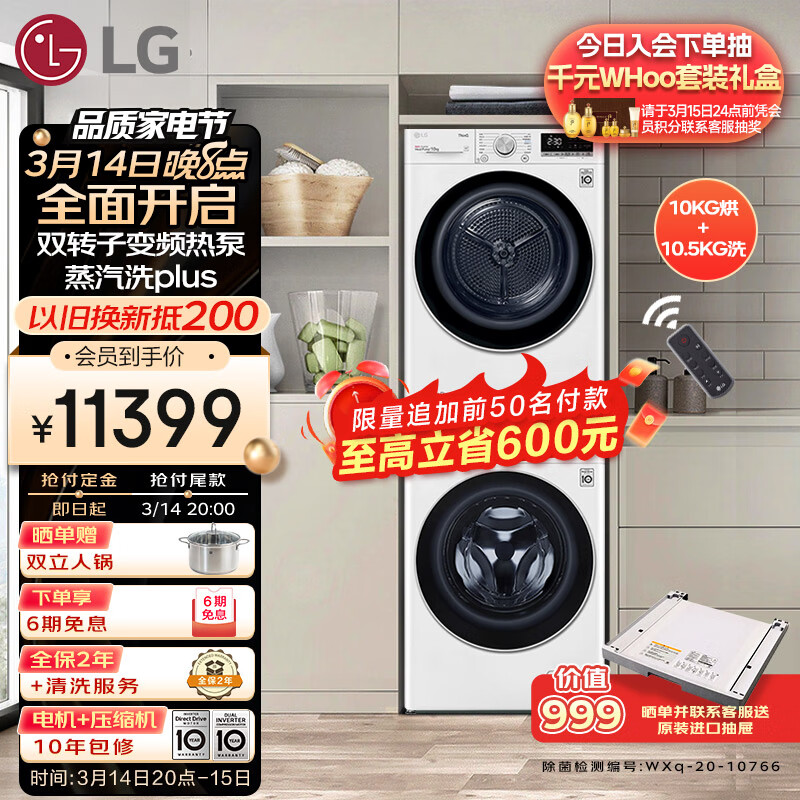 LG 洗烘套装10.5kg蒸汽除菌洗衣机+10kg双转子变频烘干机 FLW10G4W+RH10V9AV4W(附件商品仅展示)价格:11998.00元!