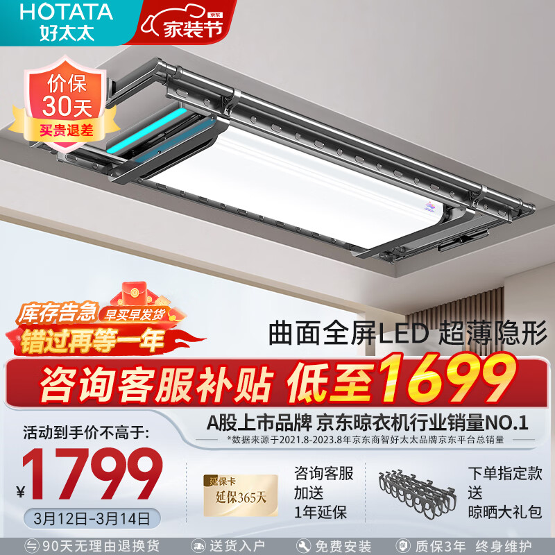 好太太(Hotata)电动智能晾衣架隐藏嵌入式消毒杀菌晒衣架D-3169 曲面屏照明价格:1699.00元!