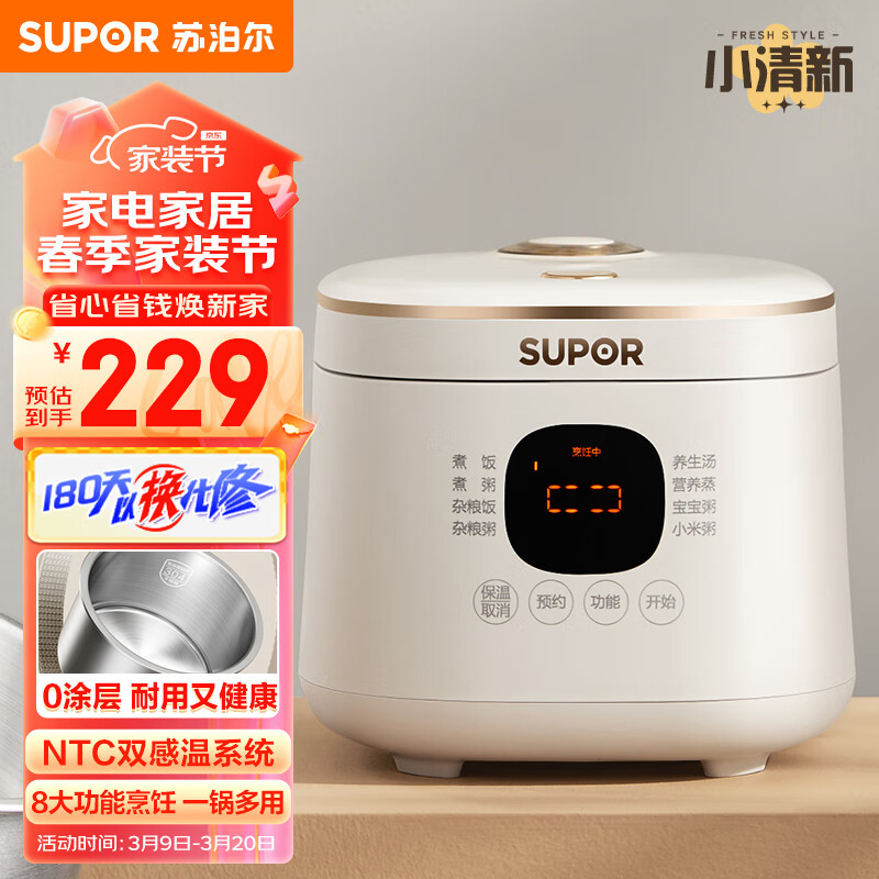 苏泊尔(SUPOR)电饭煲 电饭锅 2L无涂层304不锈钢内胆饭煲家用多功能智能触控 SF20FC945A价格:229.00元!