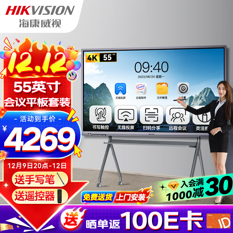 海康威视55英寸远程视频会议平板电子白板教学办公一体机4K超高清触摸显示智慧屏DS-D5B55RO/C价格:4299.00元!