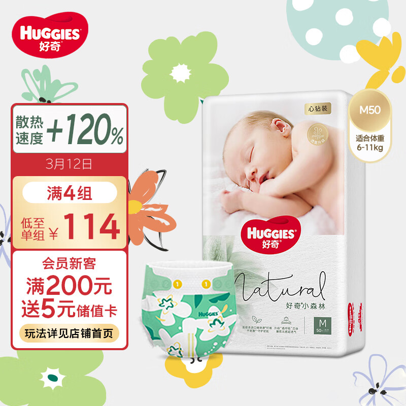 好奇(Huggies)心钻装小森林纸尿裤M50片(6-11kg)中号婴儿尿不湿纯植物织造超薄价格:129.00元!