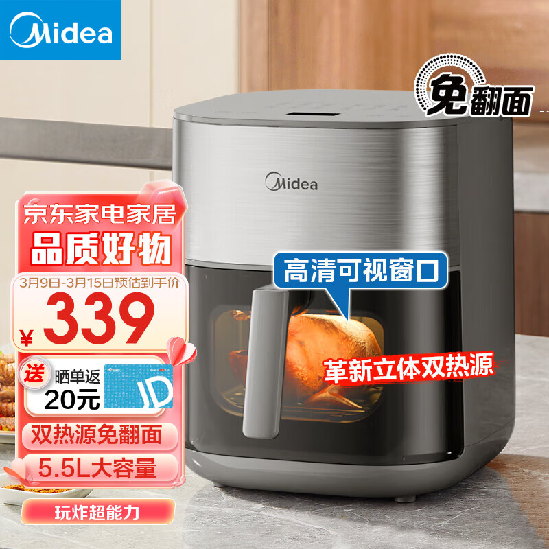 美的(Midea)小炎烤空气炸锅 双热源免翻面 5.5L家用大容量 可视窗口多功能 炸烤箱一体 不粘易清洗智能触控屏 【5.5L小炎烤】免翻面KZC559P6 5.5L价格:399.00元!