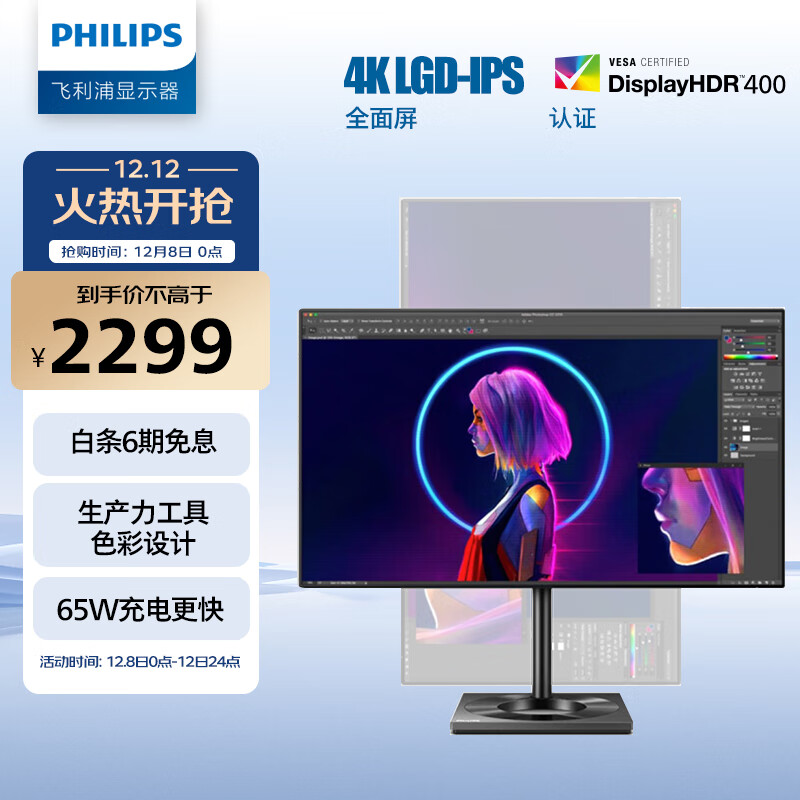飞利浦 27英寸 4K LGD-IPS悬浮屏 10bit 出厂校准 HDR400 TypeC 办公显示器 专业设计屏 IF 红点奖279C9价格:2499.00元!