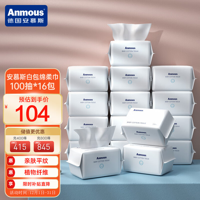 安慕斯(Anmous)婴儿绵柔巾 加厚洗脸巾(200*150mm )白色平纹款100抽*16包价格:104.00元!