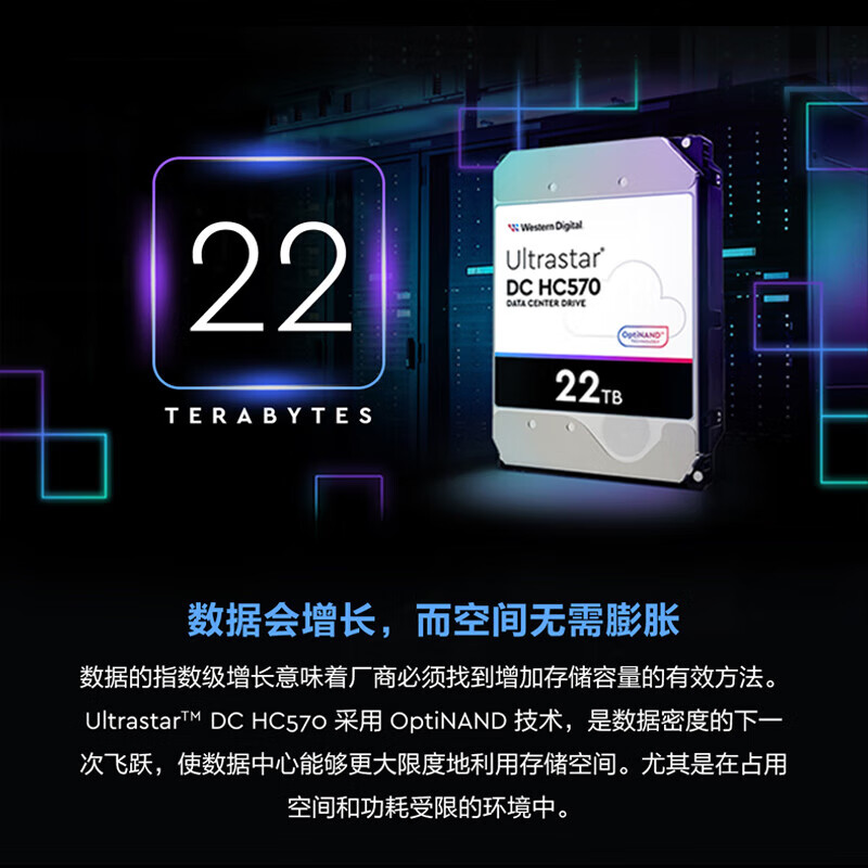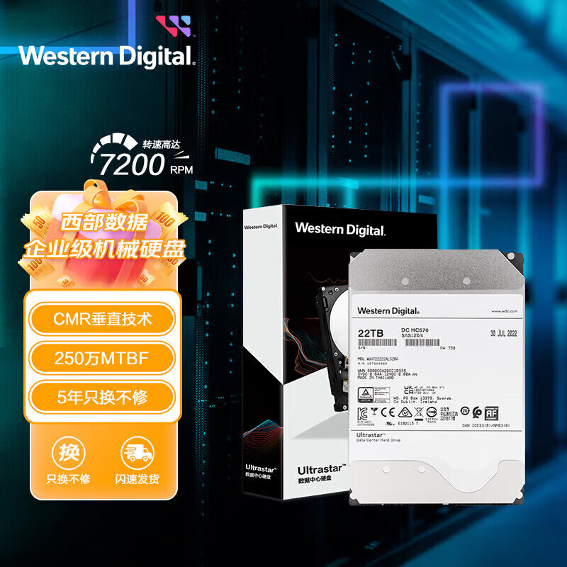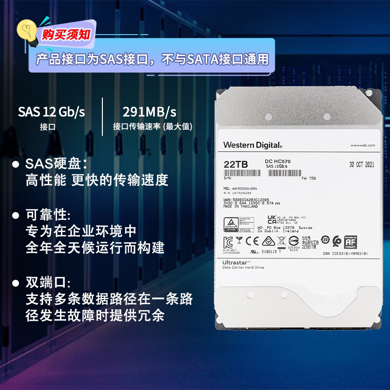 西部数据 企业级氦气硬盘 Ultrastar HC570 SAS 22TB 7200转 512MB CMR (WUH722222AL5204)价格:4299.00元!