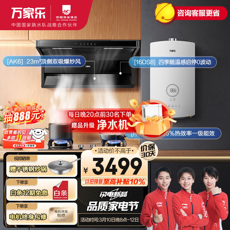 万家乐烟灶热三件套 23立方顶侧双吸油烟机16L变频水伺服燃气热水器套装AK6+KV063B+16DS8天然气价格:3699.00元!