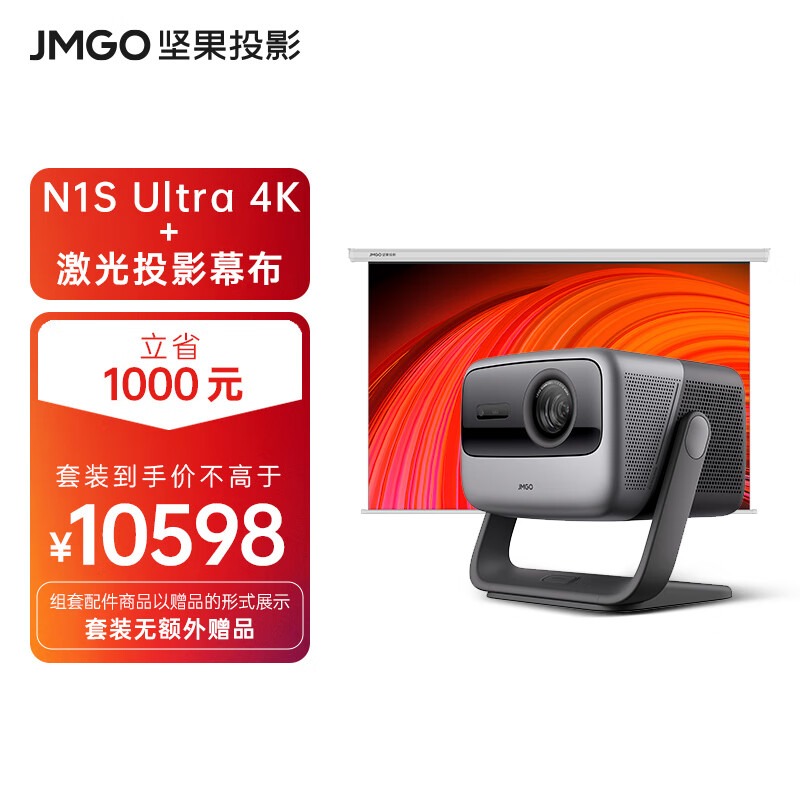坚果投影(JMGO)N1S Ultra 4K超高清三色激光 3000CVIA 云台投影仪家用套装【主机+专用增益幕布】价格:10598.00元!