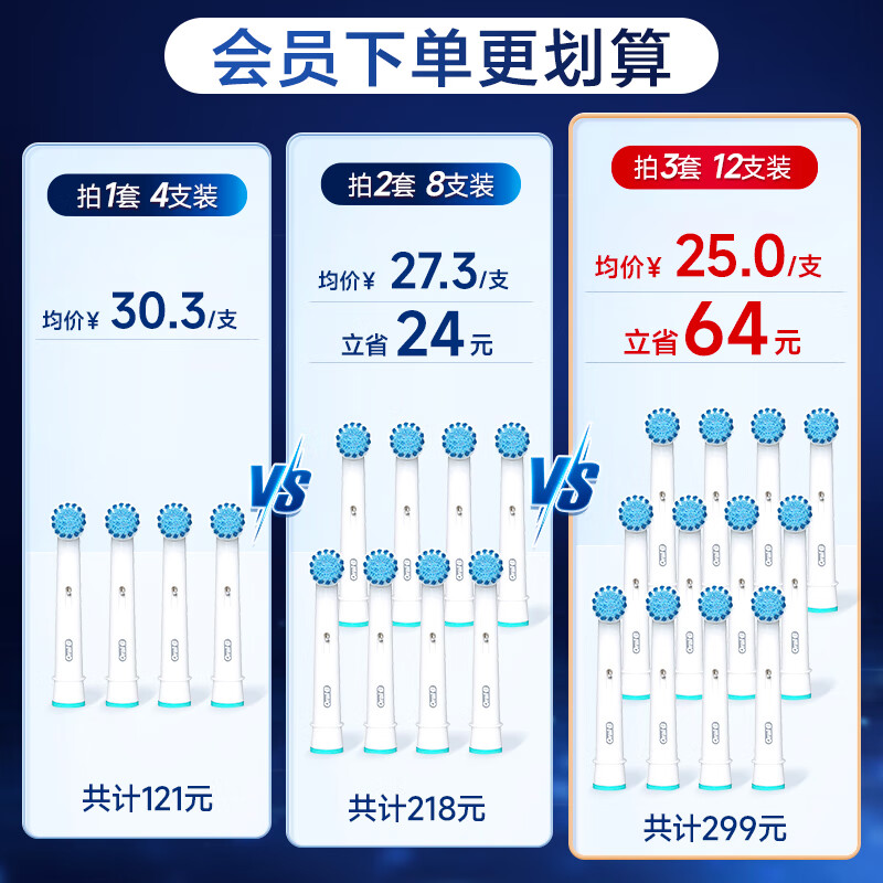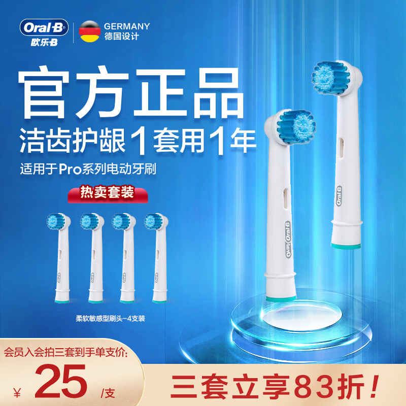 欧乐B电动牙刷头 成人柔软敏感型4支装 EB17S-4 适配成人D/P/Pro系列圆头牙刷 标准型软毛智能牙刷刷头价格:121.00元!