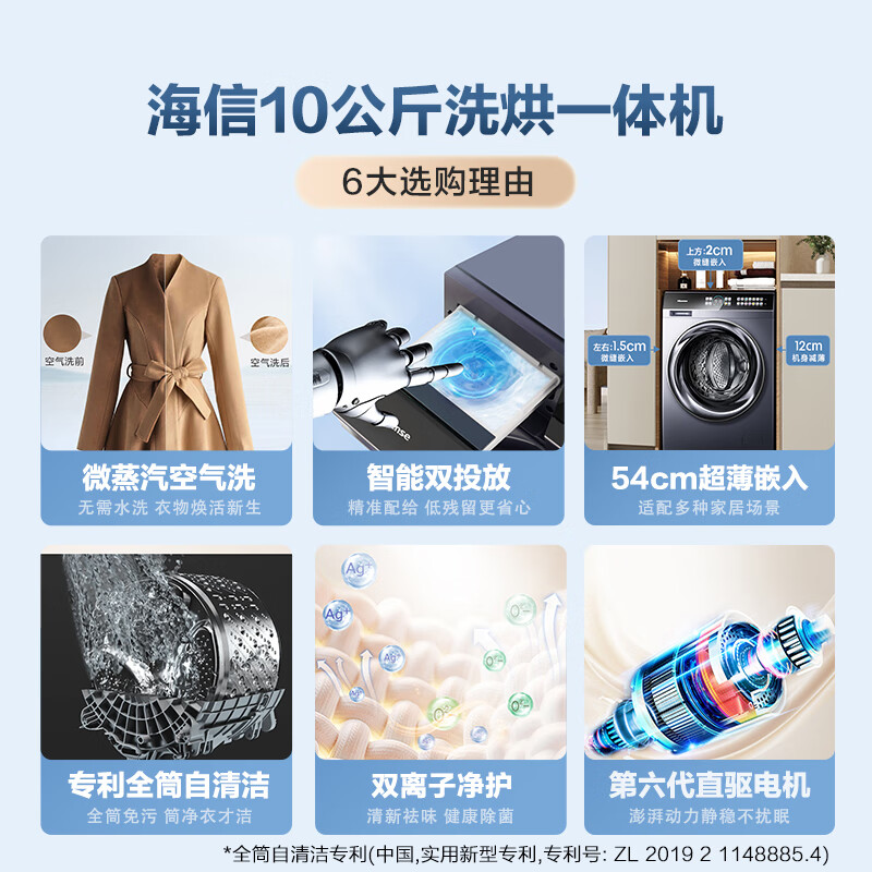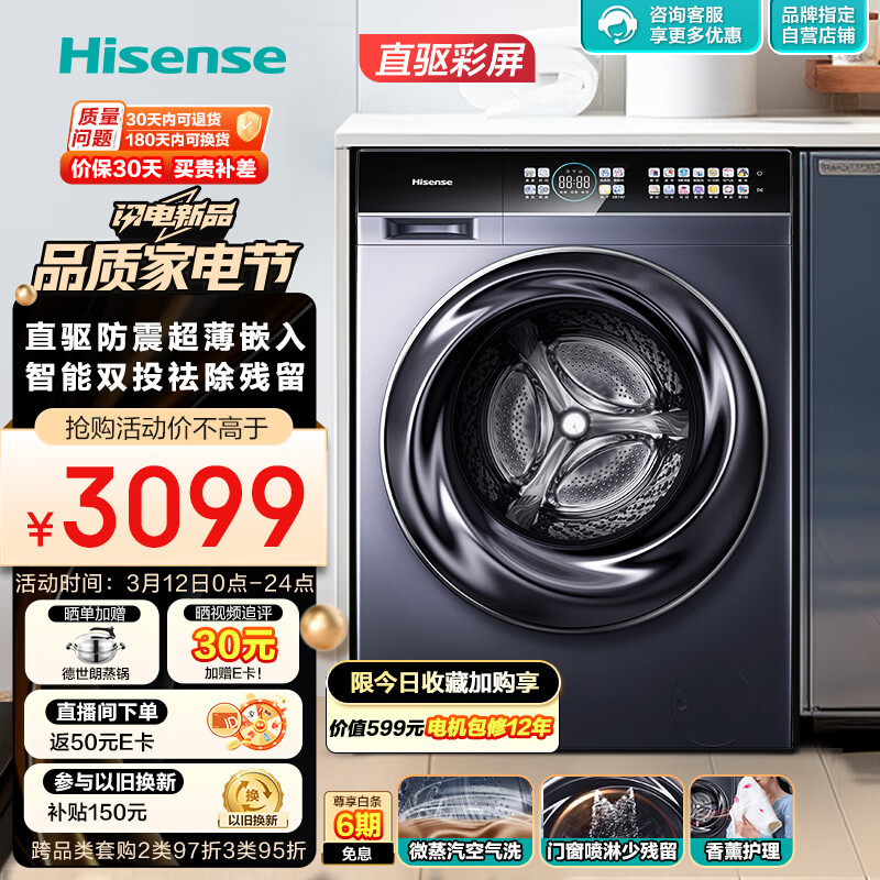海信(Hisense)滚筒洗衣机全自动 10公斤洗烘一体 直驱变频 超薄彩屏智能投放 离子除菌HD1014DCIY以旧换新价格:3099.00元!