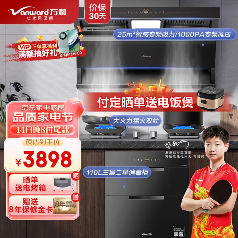万和(Vanward)烟灶消三件套 三腔7字型大吸力1000Pa变频油烟机燃气灶具消毒柜套装WL860+C5L90S+D8(天然气)价格:3897.00元!