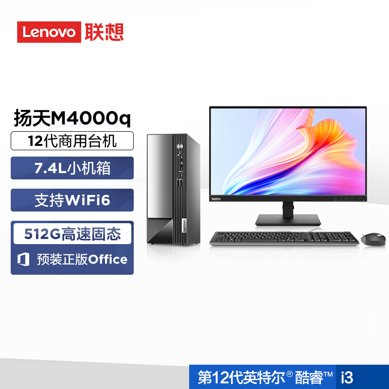 联想(Lenovo)扬天M4000q 商用办公台式电脑主机(酷睿12代i3-12100 8G 512G SSD)23英寸价格:2899.00元!