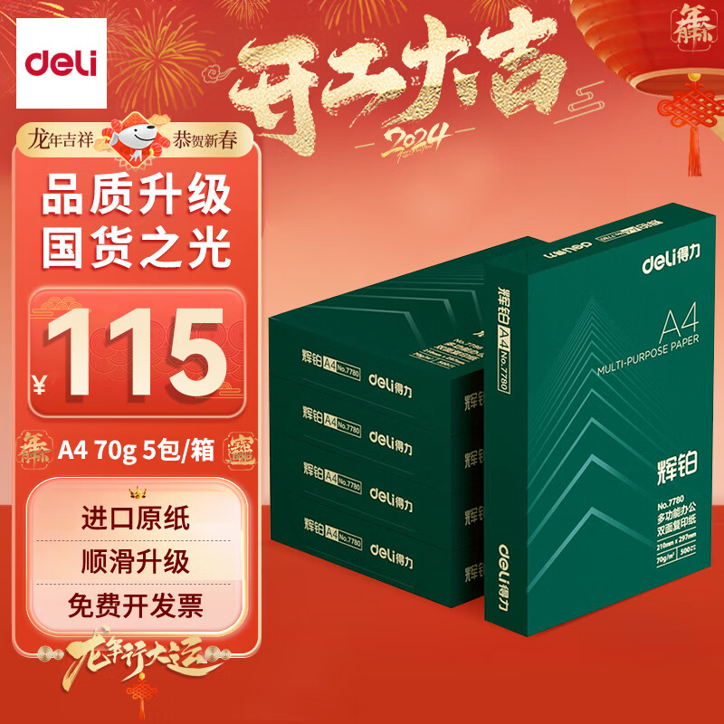 得力(deli)辉铂A4打印纸 70g500张*5包一箱 进口原纸复印纸 双面顺滑打印 整箱2500张 7783【品质升级】价格:115.00元!