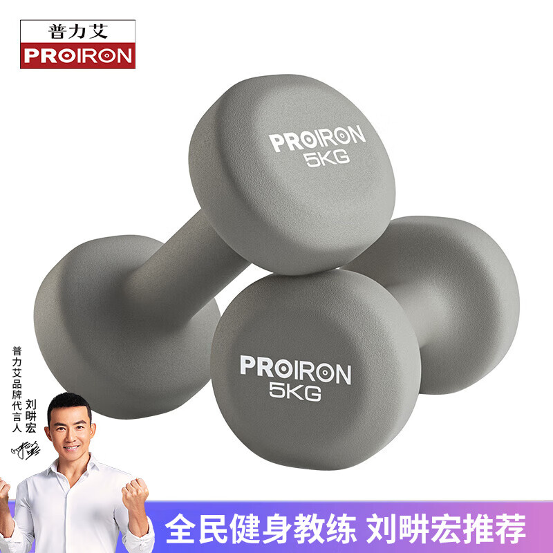 PROIRON普力艾 哑铃男女士家用浸塑纯铁环保无味健身哑铃套装亚铃5kg*2价格:139.00元!