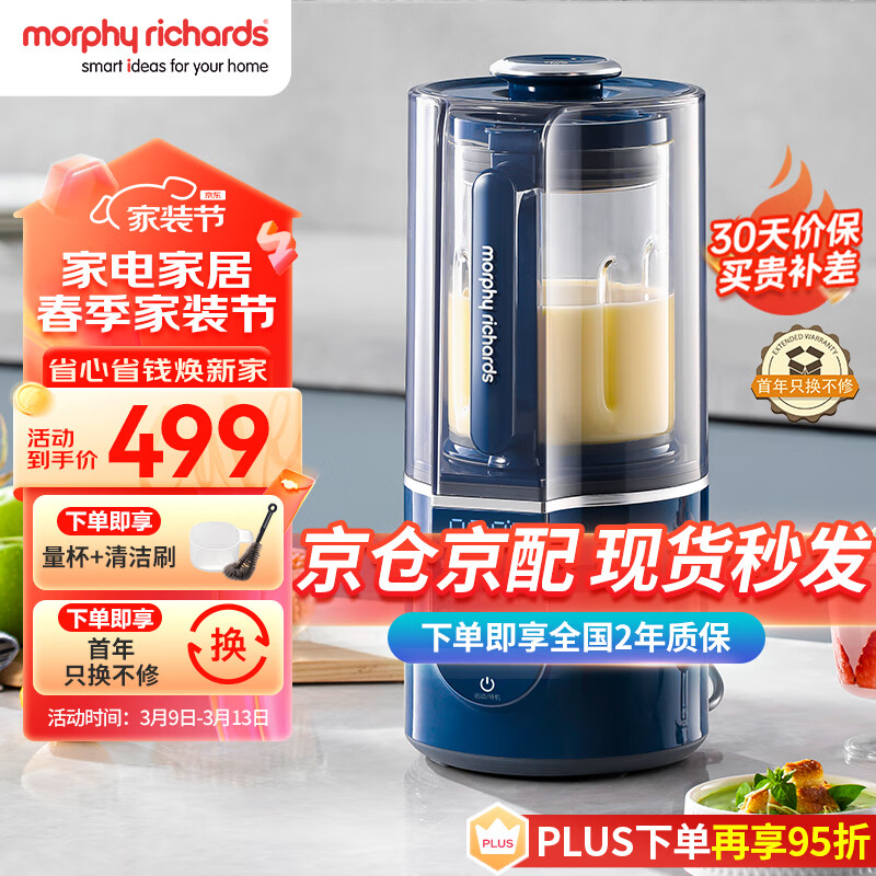 摩飞电器(Morphyrichards)破壁机 家用柔音豆浆机多功能加热全自动榨汁机搅拌机一键清洗预约保温隔音降噪辅食机MR8201蓝价格:499.00元!