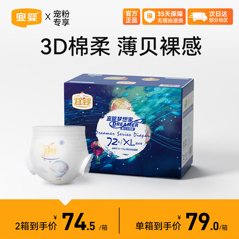 宜婴直播专享 梦想家全包臀小内裤箱装XL72片尿不湿【11.5-13.5kg】价格:132.00元!