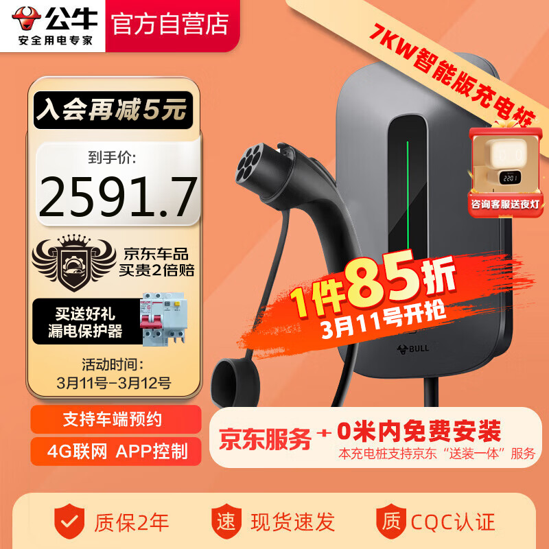 公牛新能源汽车交流充电桩适用小米su7理想MEGA特斯拉比亚迪等 7KW-智能款 送装一体含0米安装价格:3049.00元!