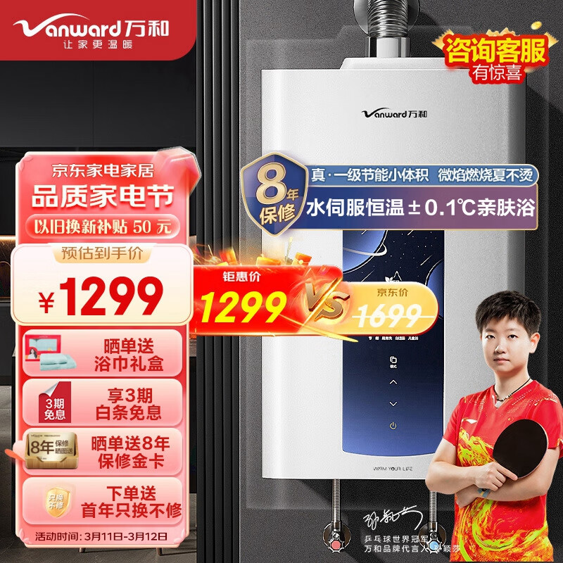 万和(Vanward)燃气热水器16升天然气小体积设计【真·一级节能】速热舱换热微焰控温±0.1°C水伺服恒温 ME5J16价格:1699.00元!