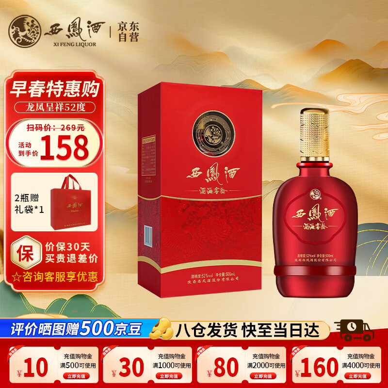 西凤酒 龙凤呈祥白酒52度纯粮食凤香型高度婚宴喜酒自饮送礼500ml单瓶价格:158.00元!