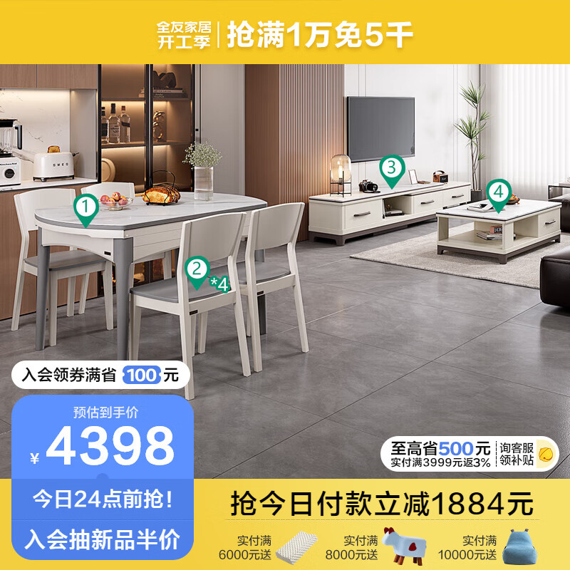 全友家居 现代岩板客餐厅7件套装120709茶几电视柜DW1028一桌四椅组合价格:6282.86元!