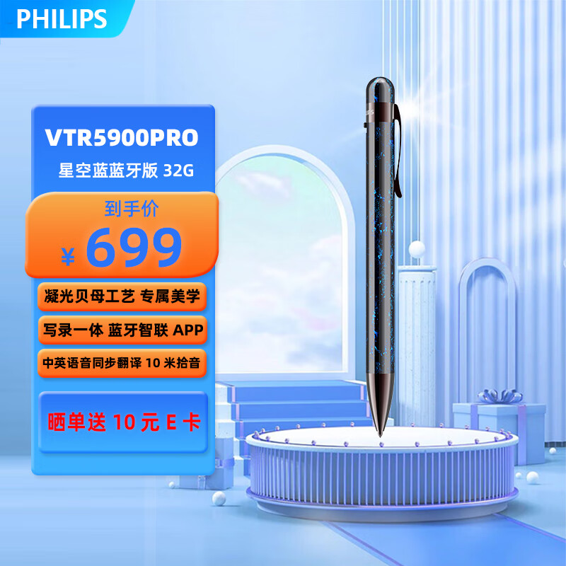 飞利浦(PHILIPS)录音笔VTR5900Pro 星空蓝 专业语音转文字高清降噪便携一键操作录音器32G蓝牙版价格:799.00元!