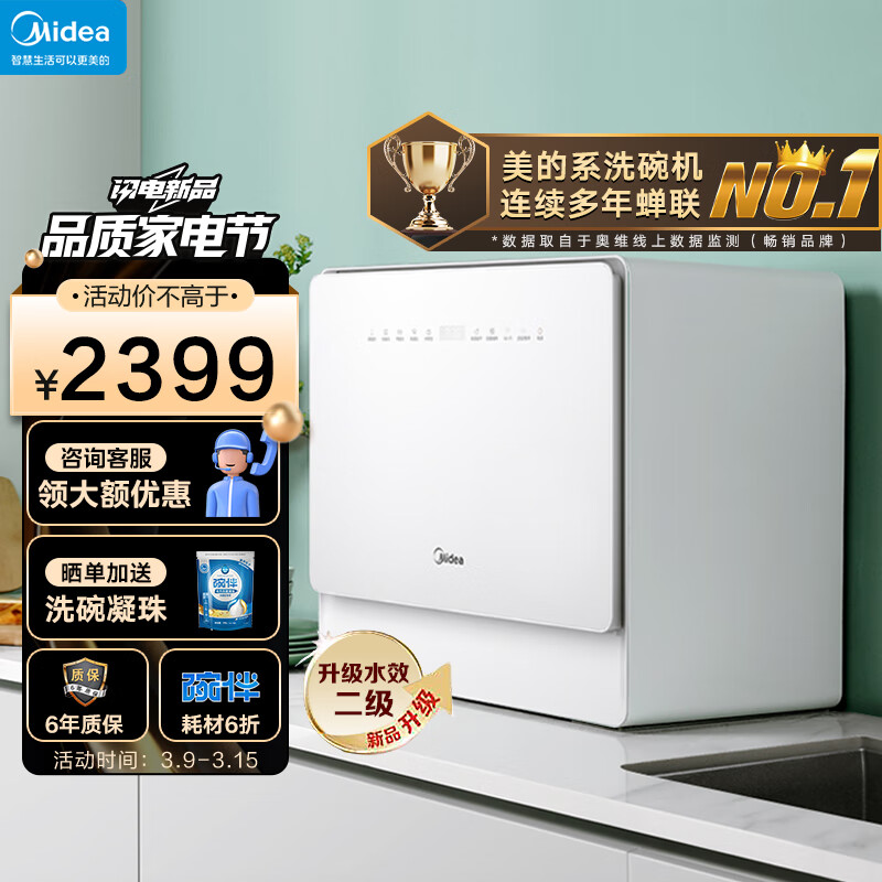 美的(Midea)5套 洗碗机台式 UP2(极地)升级二级水效 高温除菌 85℃热风烘干 三旋劲洗 双层碗篮 水果海鲜洗价格:2399.00元!