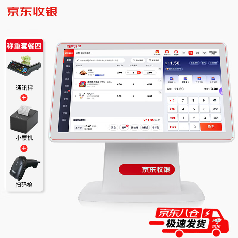 京东收银 京东支付收银机一体机超市零售便利店收款机称重收银系统软件餐饮扫码点餐 收银机+扫码枪+小票机+通讯秤+收银软件价格:2356.00元!