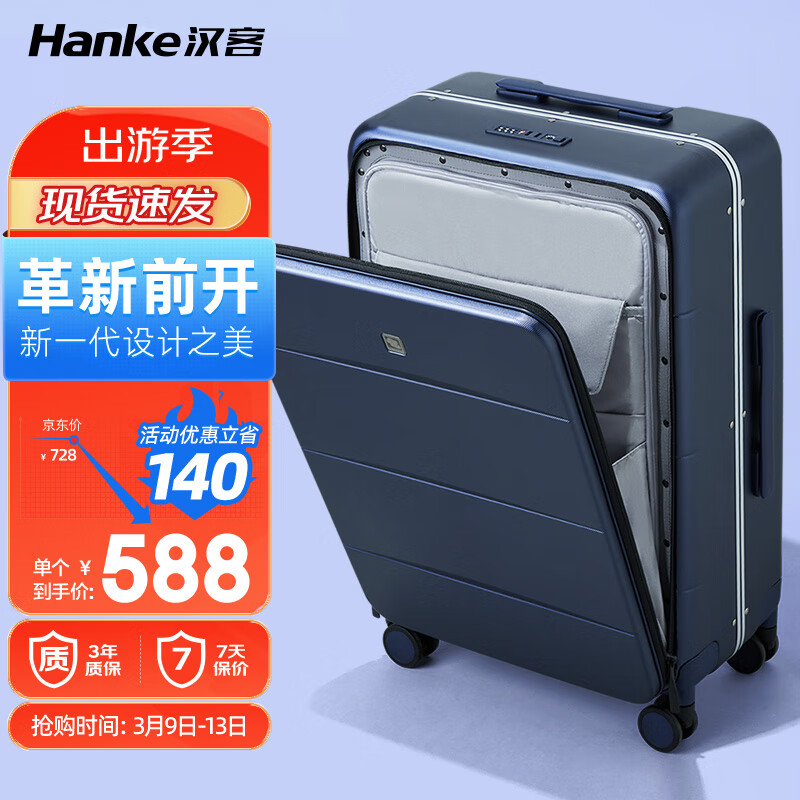 汉客前开盖拉杆箱铝框箱大容量行李箱旅行箱24英寸黛蓝色男女密码箱价格:728.00元!