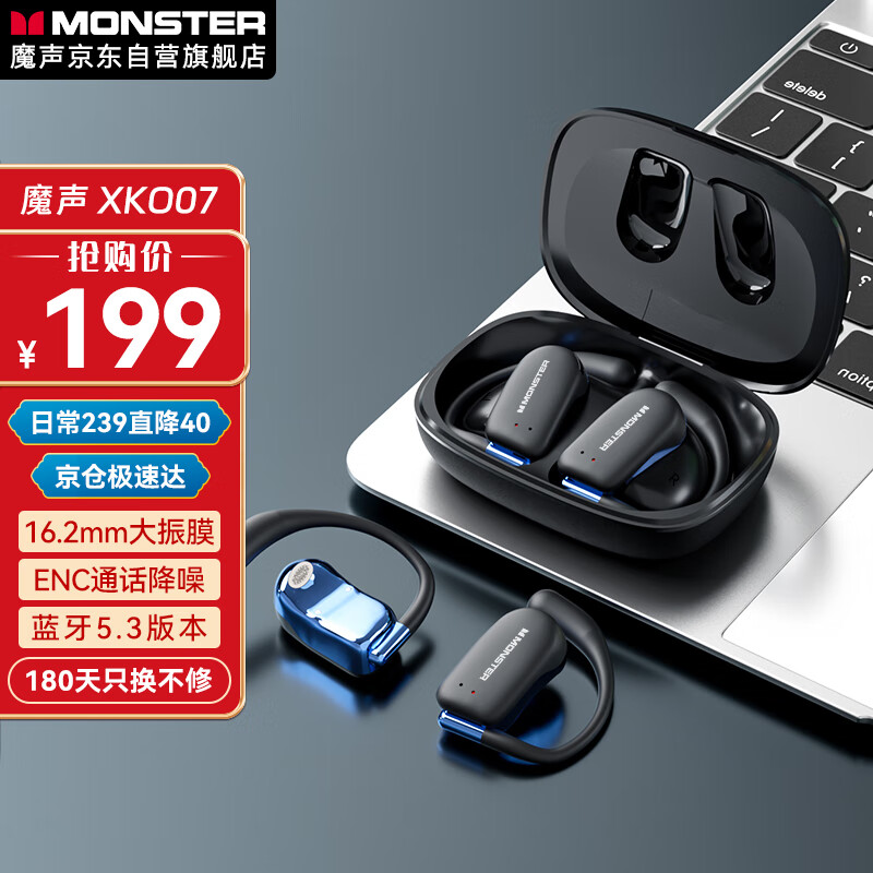 魔声(MONSTER)XKO07挂耳式蓝牙耳机不入耳智能降噪跑步运动耳机适用于华为苹果小米无线耳机 黑色价格:239.00元!
