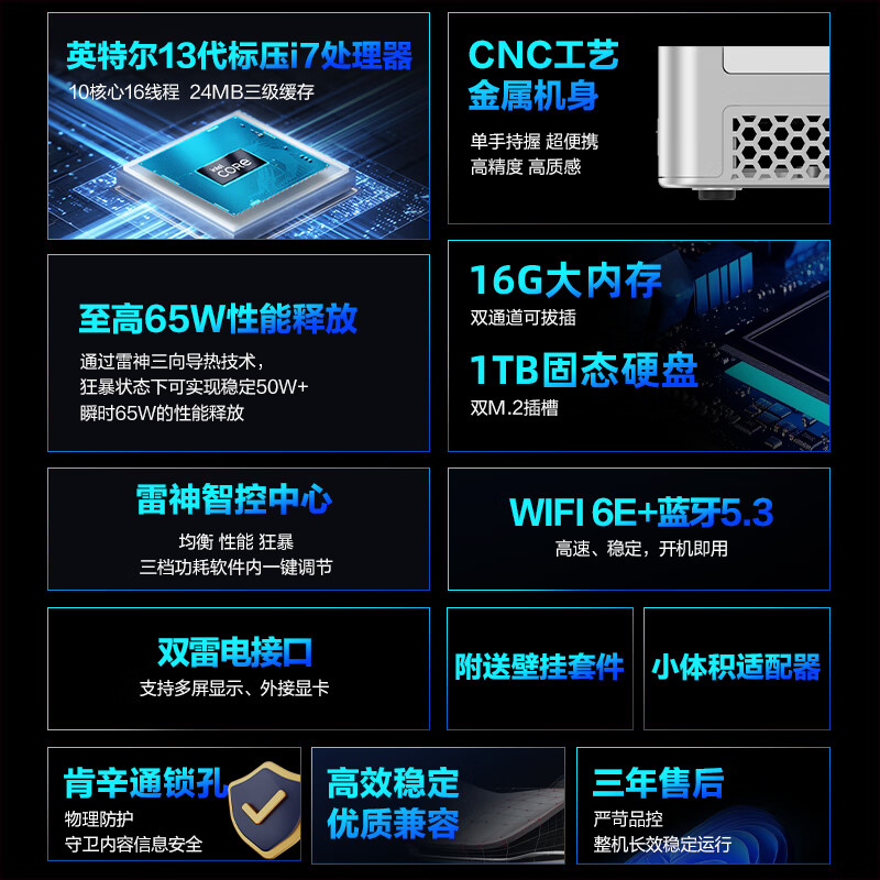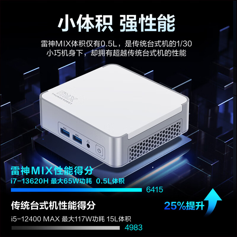雷神(ThundeRobot)MIX 高性能商务办公游戏电脑mini口袋台式NUC迷你主机(13代酷睿i7-13620H 16G 1TSSD WIFI6E)价格:2999.00元!