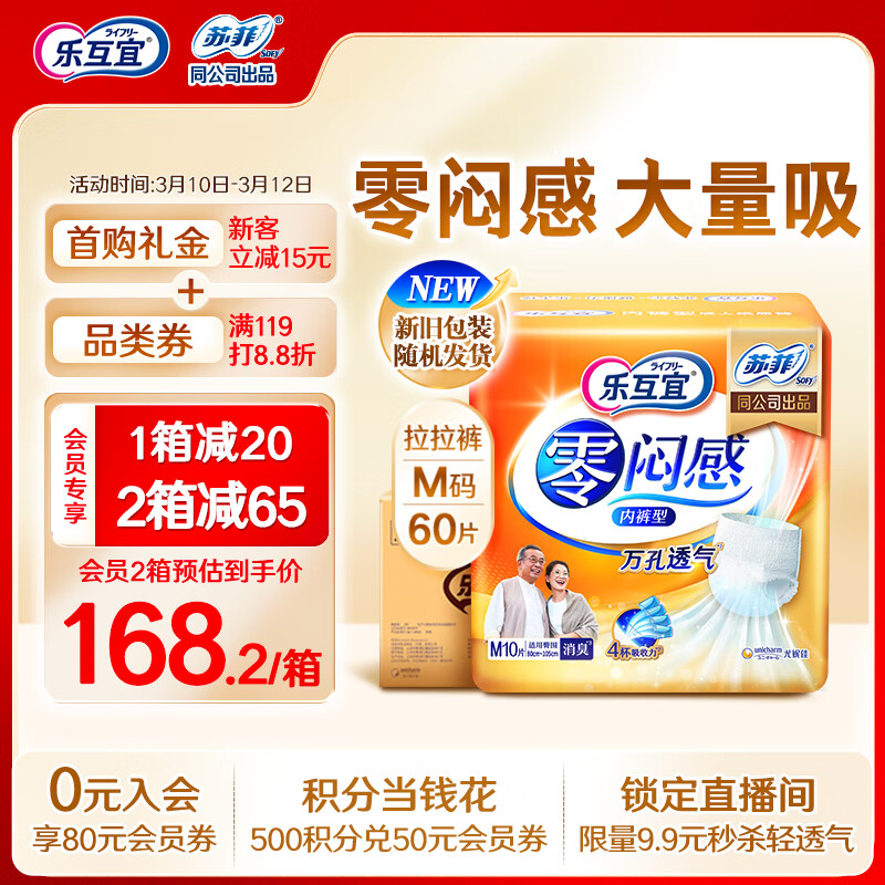 乐互宜零闷感成人拉拉裤老年人透气消臭内裤型尿不湿M码60片/箱价格:228.00元!