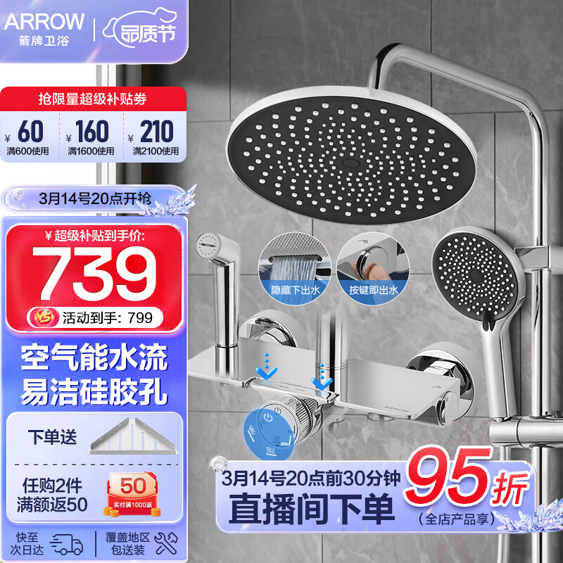箭牌(ARROW)淋浴花洒套装 自洁淋浴喷头升级下出水 洗澡沐浴易洁手持顶喷 四功能空气能增压花洒34125CP价格:1069.00元!