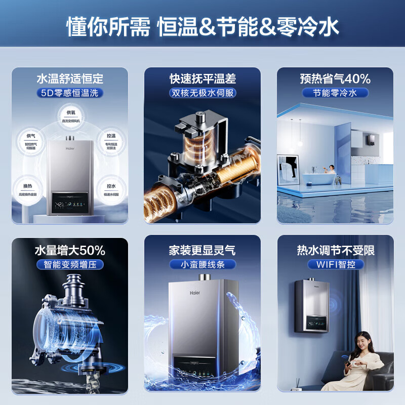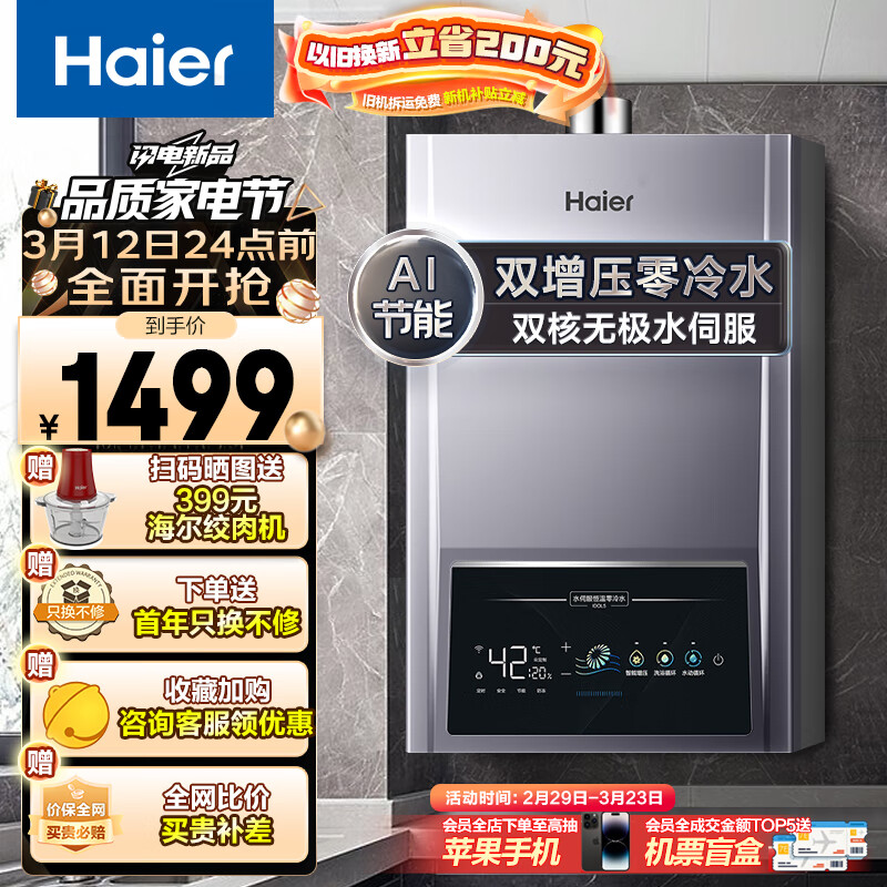 海尔(Haier)13升燃气热水器天然气 双核无极水伺服 大水量双增压零冷水 AI智慧节能节能 JSQ25-13IDOL5-PU1价格:1599.00元!