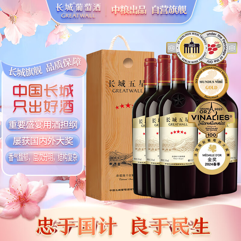 长城 五星赤霞珠 干红葡萄酒 750ml*6瓶 整箱装 木盒整箱价格:2131.00元!