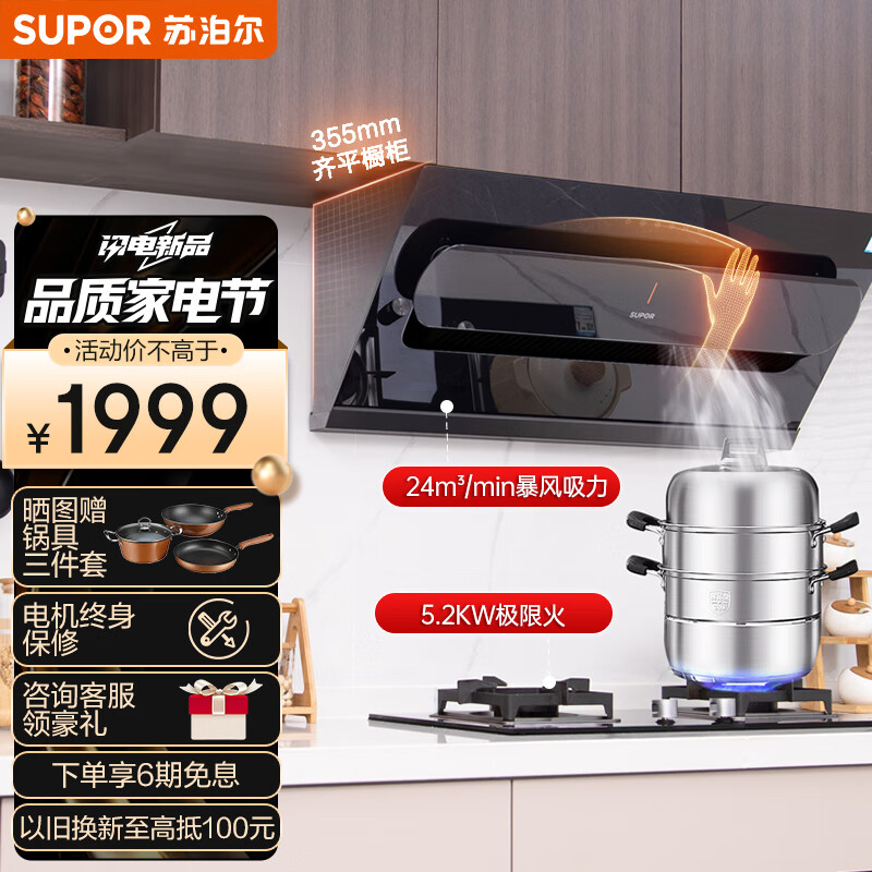 苏泊尔(SUPOR)抽油烟机 24m3/min大吸力 变频侧吸式脱排抽吸油烟机家用 挥手智控免拆洗烟灶套装 DJ50S+DB28天价格:1999.00元!