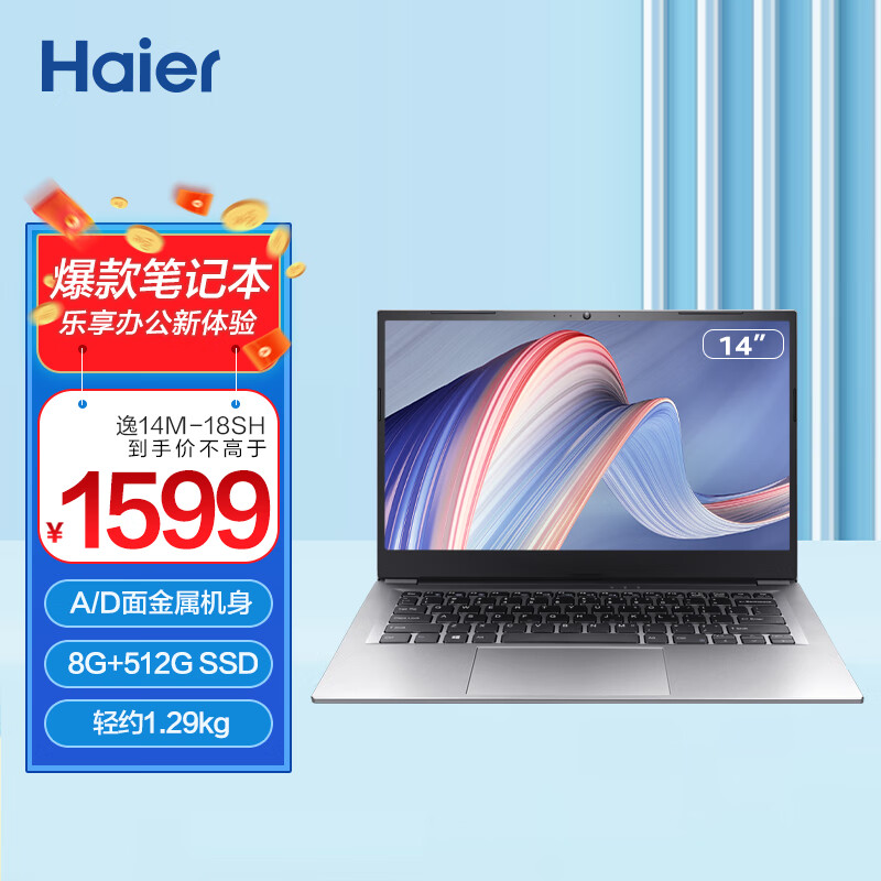 海尔(Haier) 14英寸金属笔记本电脑 商务办公学生网课影音娱乐轻薄本 逸14M-18SH(8G 512G SSD Win11)价格:1599.00元!