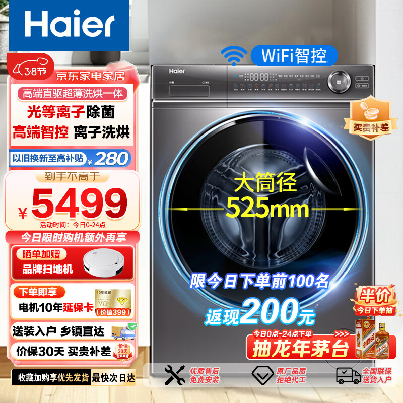 海尔(Haier)10KG全自动滚筒洗烘一体洗衣机带烘干 超薄直驱变频精华洗省水省电 光等离子除菌 APP智控以旧换新价格:5699.00元!