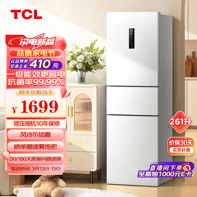 TCL261升白色三门三温区冰箱双变频一级能效 风冷无霜 AAT负离子养鲜 小型家用电冰箱 R261V3-C价格:1699.00元!